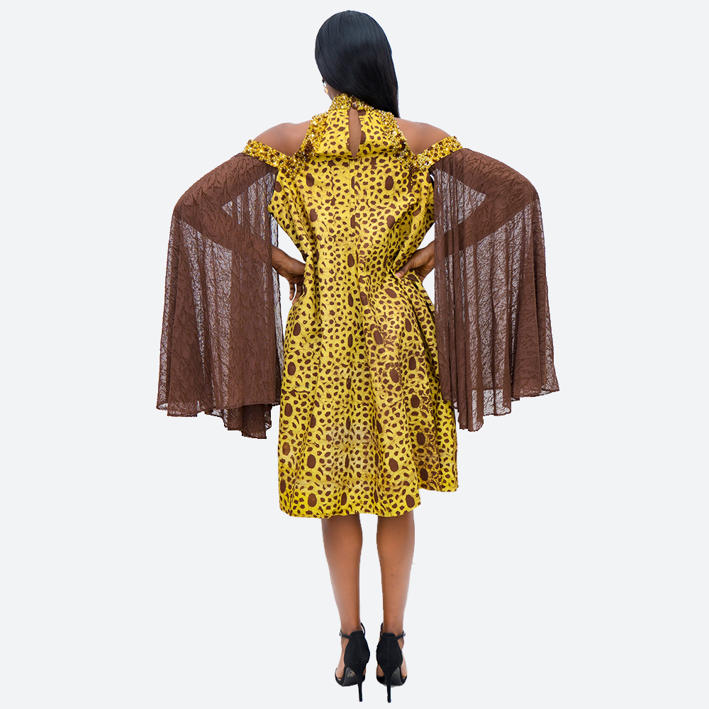 Beaded Drop Shoulder High Neck Dress with Flare Net Sleeve